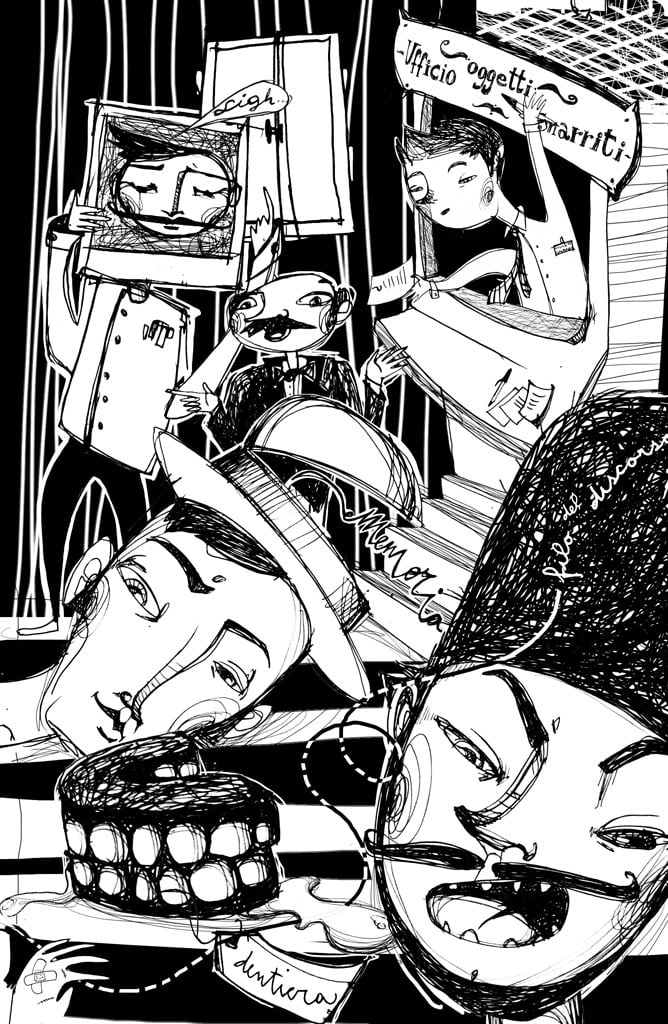 Alle loro spalle, tra sbuffi e spintoni, un Uomo col Cappello sulle Ventitré farfugliava confusamente che qualcuno (non ricordava chi) l’aveva indirizzato in quell’Ufficio perché aveva perso la memoria. In quel mentre un Celebre Oratore seguitava a urlare: «Insomma! Sono due settimane che vengo qua, e domani ho la conferenza… Allora, l’avete trovato il filo del mio discorso?»